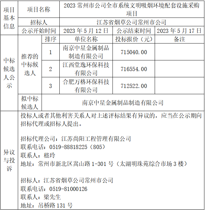 2023常州市公司全市系統(tǒng)文明吸煙環(huán)境配套設(shè)施采購項目中標(biāo)候選人公示