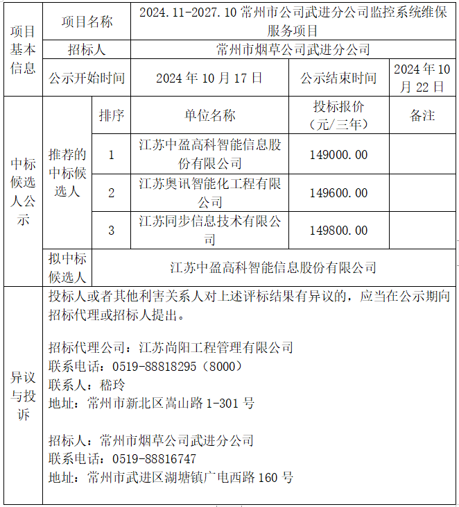 2024.11-2027.10常州市公司武進分公司監(jiān)控系統(tǒng)維保服務項目中標候選人公示
