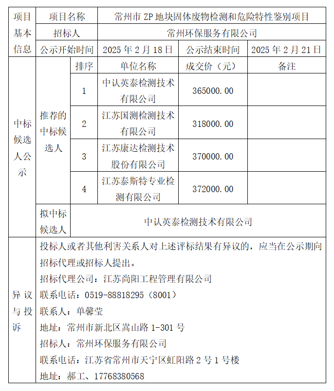 常州市ZP地塊固體廢物檢測(cè)和危險(xiǎn)特性鑒別項(xiàng)目成交候選人公示