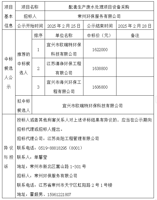 配套生產(chǎn)廢水處理項(xiàng)目設(shè)備采購(gòu)中標(biāo)候選人公示