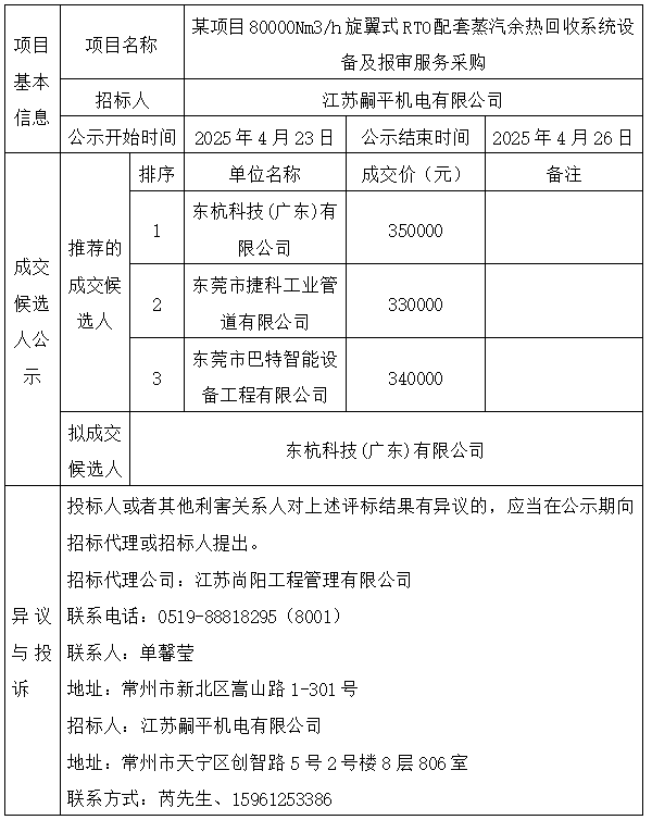 某項目80000Nm3/h旋翼式RTO配套蒸汽余熱回收系統(tǒng)設(shè)備及報審服務(wù)采購成交候選人公示