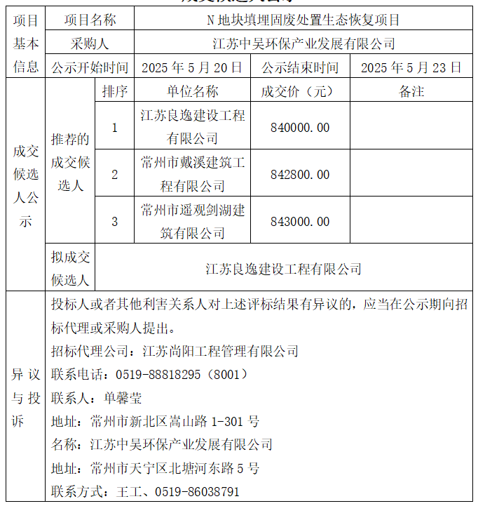 N地塊填埋固廢處置生態(tài)恢復(fù)項目成交候選人公示