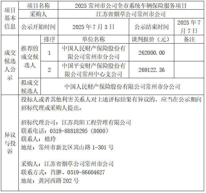 2025常州市公司全市系統(tǒng)車輛保險服務項目成交候選人公示