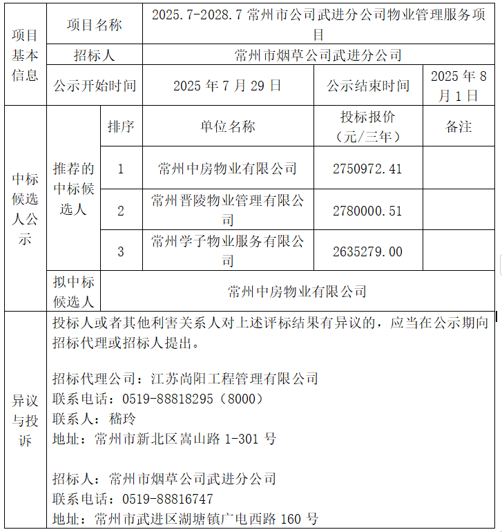 2025.7-2028.7常州市公司武進分公司物業(yè)管理服務(wù)項目中標(biāo)候選人公示