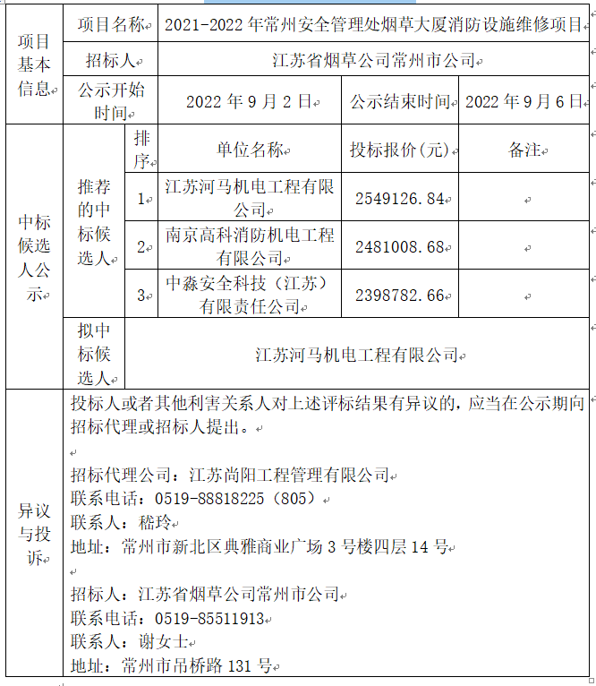 2021-2022年常州安全管理處煙草大廈消防設(shè)施維修項目中標(biāo)候選人公示